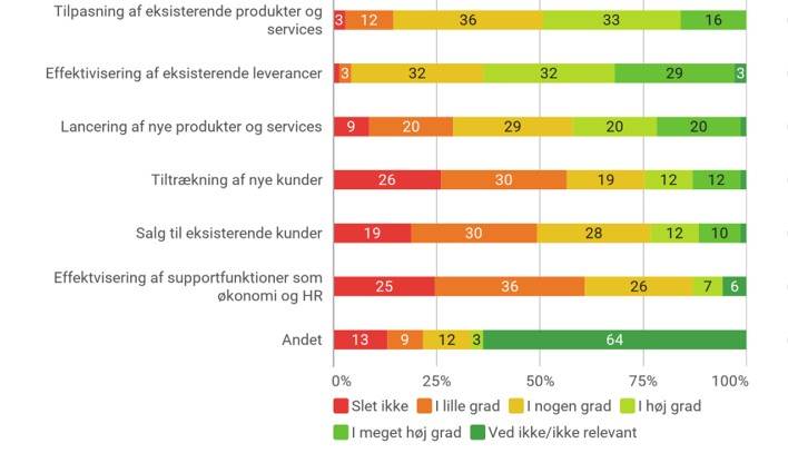 For mange handler AI om effektivisering: 61 pct. bruger AI i høj eller meget høj grad til at optimere eksisterende leverancer, mens knap halvdelen bruger AI til at tilpasse produkter og services.