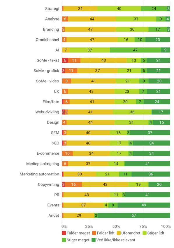 Strategi, som i en årrække var bureauledernes vigtigste forretningsområde, halter pænt bagefter – men er dog på en andenplads – med 64 pct., når man sammenlægger ‘stiger lidt’ og ‘stiger meget’.