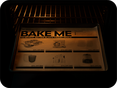 Kitchen Warehouse gjorde Black Friday fysisk ved at distribuere specialdesignet bagepapir, hvor ekstra rabatter først blev synlige, når papiret blev bagt i ovnen. Et digitalt tilbud blev til en taktil handling. Kampagnen kunne stadig aktiveres online, men vejen dertil skabte et øjeblik af leg midt i en ensartet tilbudsstrøm.
