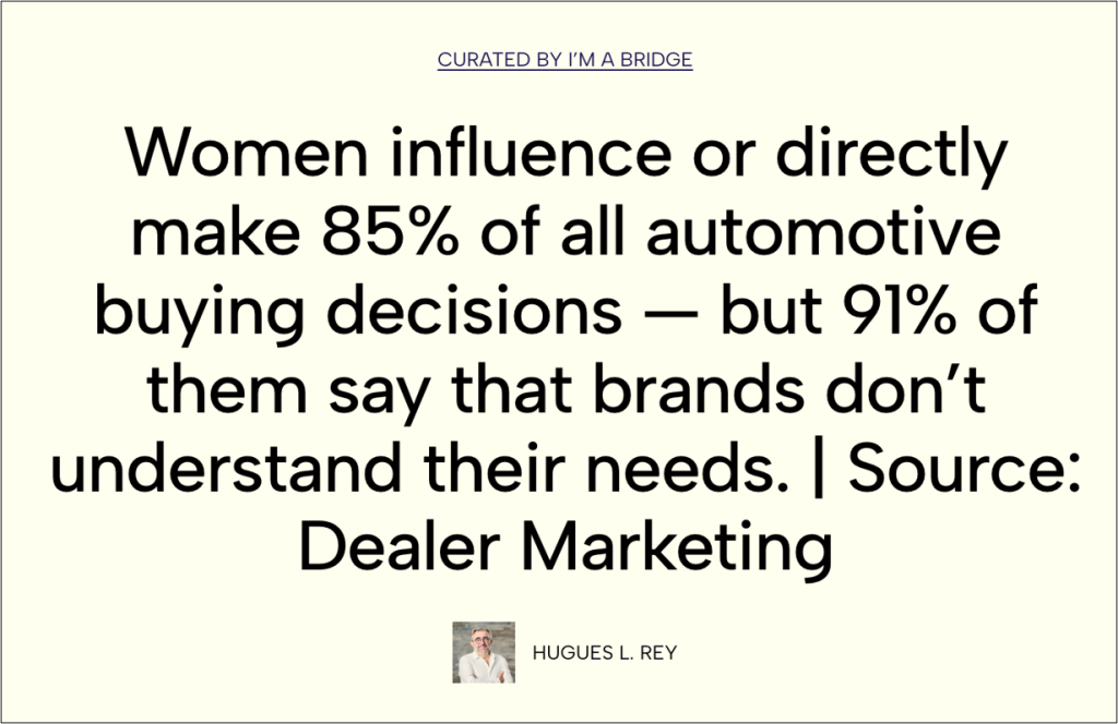 Måske vil det også hjælp,e at man begynder at arbejde med unikke data, fremfor at bruge de samme, som alle andre. Så ville man opdage, at det i dag ikke længere er maskuline kriterier, der dominerer beslutningsprocesserne. Analysen viser, at kvinder dominerer, når det gælder valg af bil. Analysen fortæller så også, at kvinderne ikke føler, at bilerne taler til deres behov.
