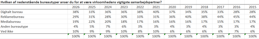 Reklamebureauerne, der historisk har haft førertrøjen, oplever fortsat tilbagegang. Efter en marginal stigning sidste år til 31 pct. er andelen nu faldet til 29 pct. Mediabureauerne står nogenlunde stille med 19 pct.